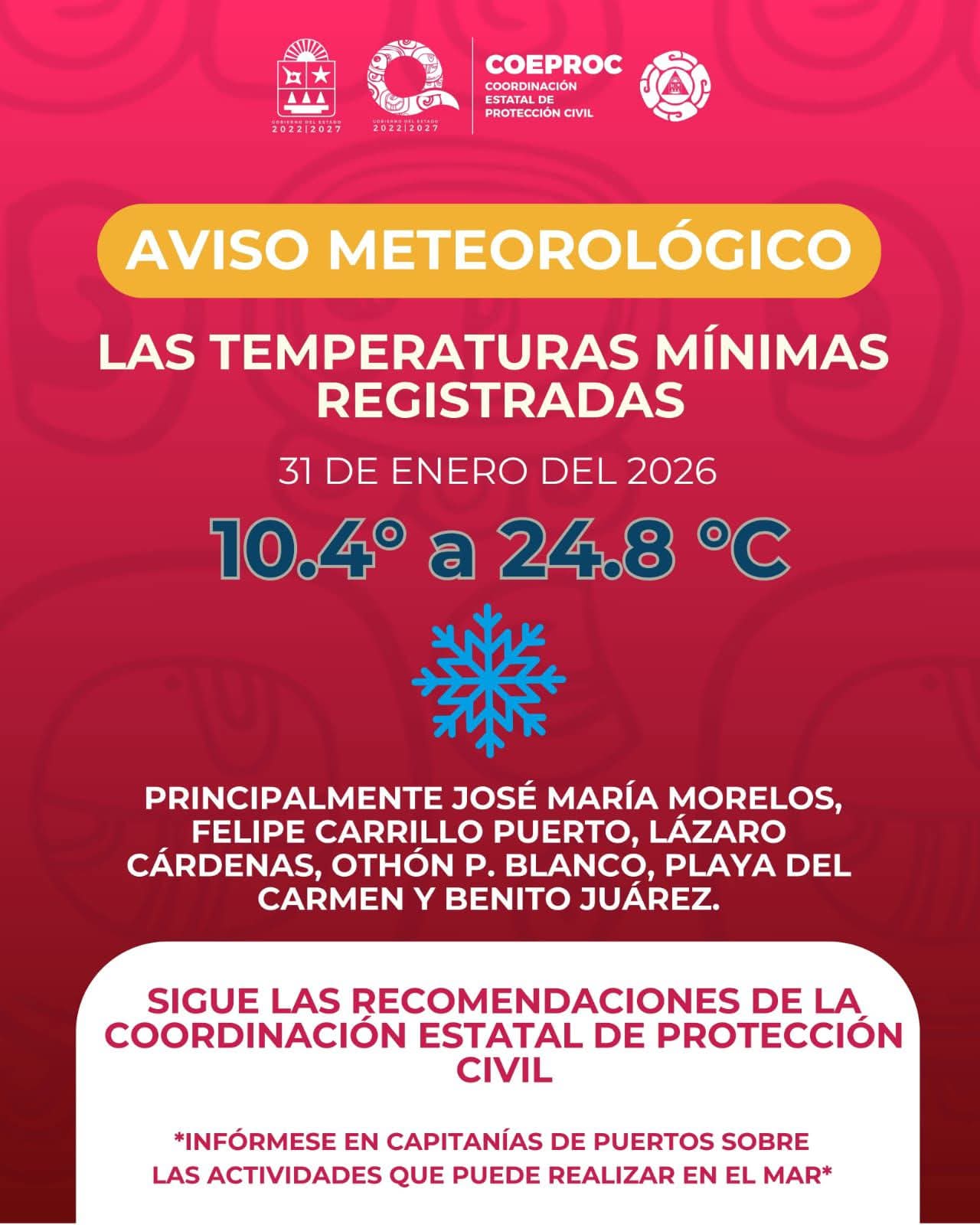📌🌡Se prevé que estas temperaturas mínimas continuarán disminuyendo durante este fin de semana y al inicio de la próxima semana, tras el paso del frente frío número 32 durante este sábado 31de enero.