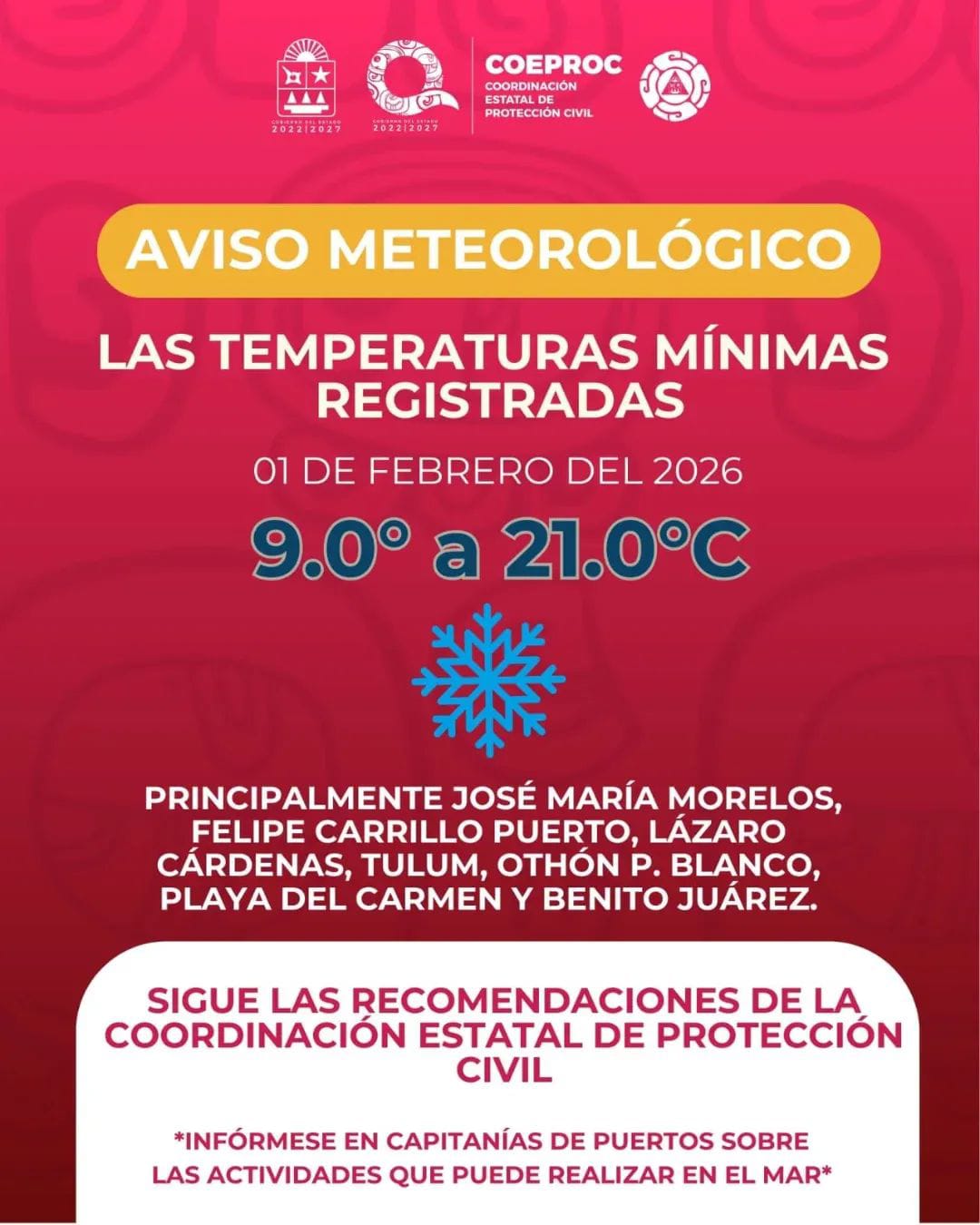 📌Se prevé que estas temperaturas mínimas continuarán disminuyendo durante este fin de semana y al inicio de la próxima semana, tras el paso del frente frío número 32 durante este sábado 31de enero.