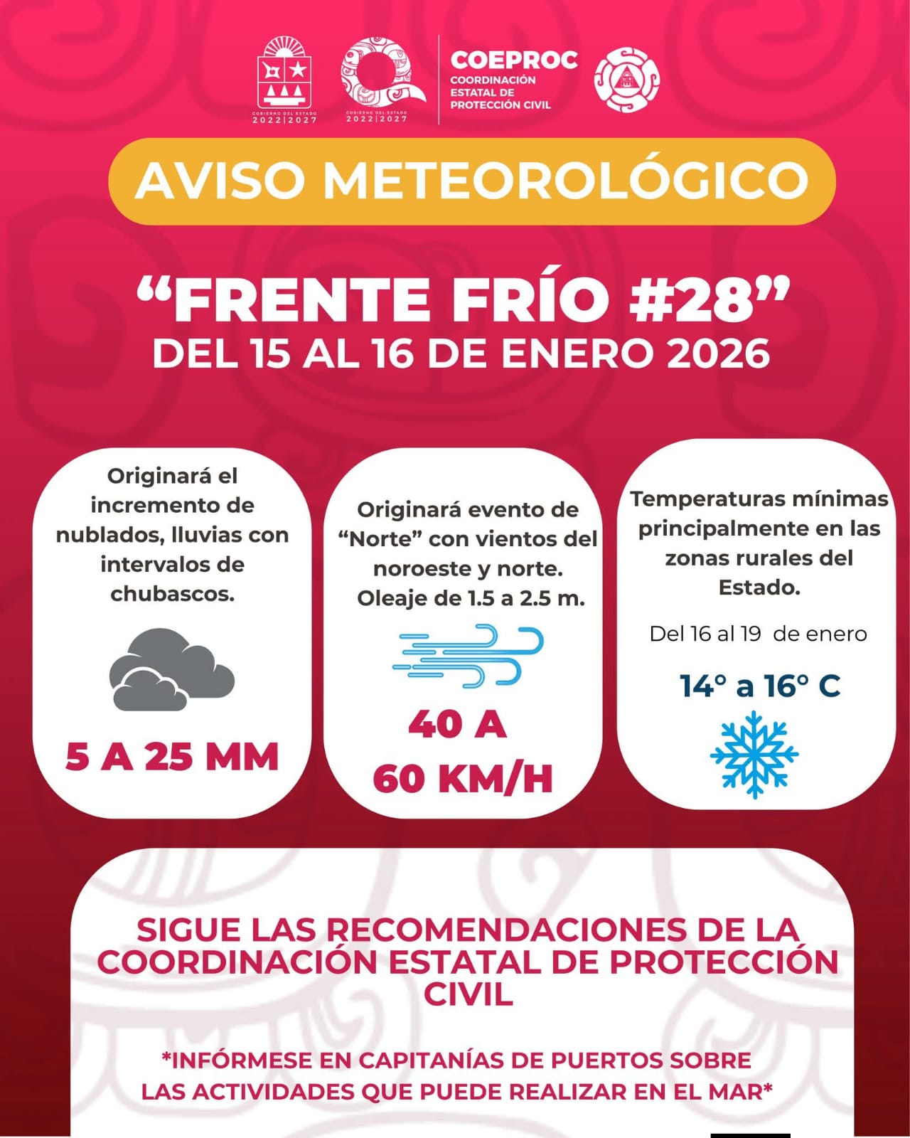 Debido al acercamiento y desplazamiento del Frente Frío número Veintiocho, a la porción norte de la Península de Yucatán y del Estado de Quintana Roo, se pronostica: