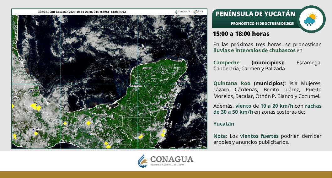 En las próximas tres horas, se pronostican lluvias e intervalos de chubascos con descargas eléctricas en los municipios de: Isla Mujeres, Lázaro Cárdenas, Benito Juárez, Puerto Morelos, Bacalar, Othón P. Blanco y Cozumel.