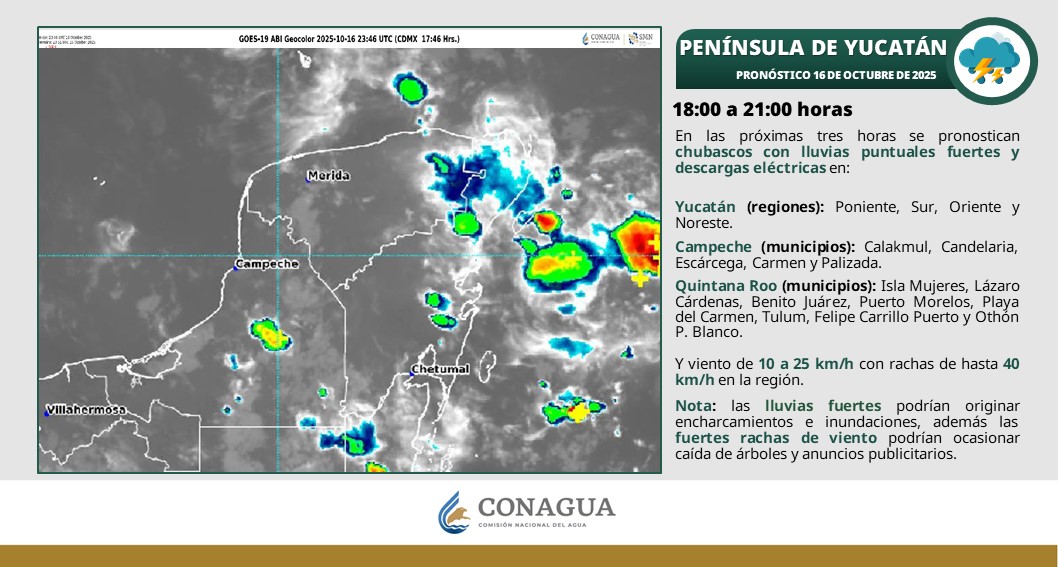 En las próximas tres horas, se pronostican chubascos con lluvias puntuales fuertes y descargas eléctricas en los municipios de: Isla Mujeres, Lázaro Cárdenas, Benito Juárez, Puerto Morelos, Playa del Carmen, Tulum, Felipe Carrillo Puerto y Othón P. Blanco.