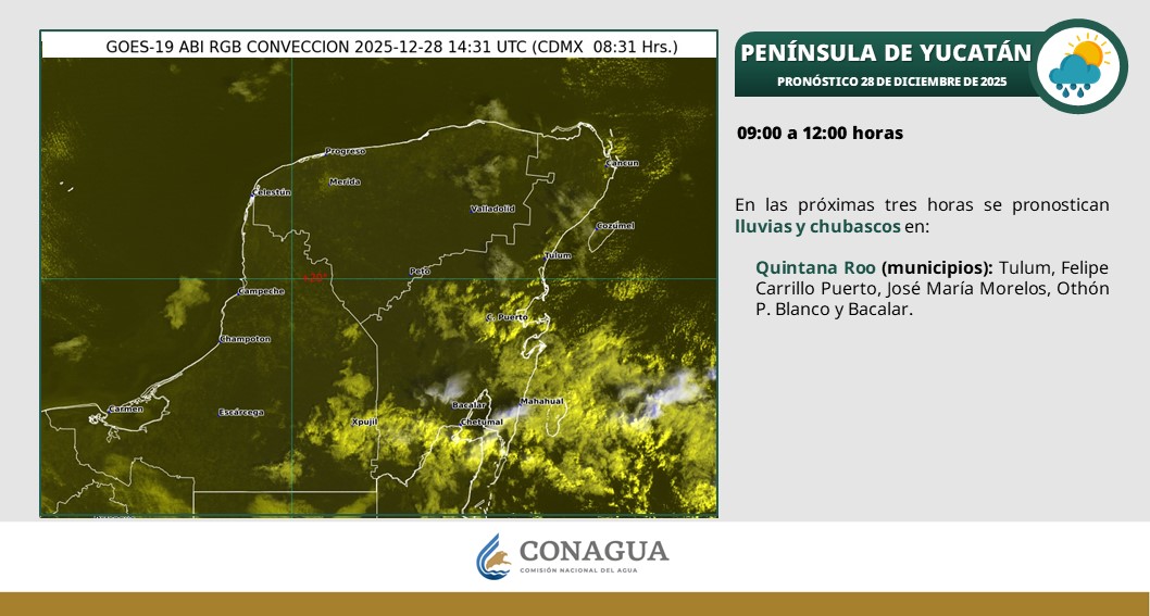 En las próximas tres horas se pronostican lluvias y chubascos en los municipios de: Tulum, Felipe Carrillo Puerto, josé María Morelos, Othón P. Blanco y Bacalar.
