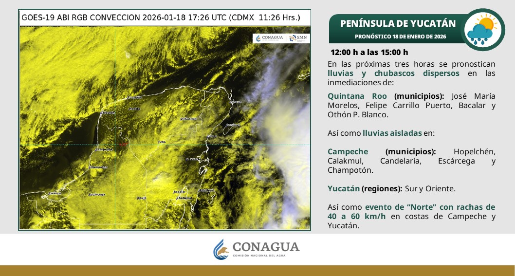 En las próximas tres horas se pronostican lluvias y chubascos en los municipios de: Lázaro Cárdenas, Benito Juárez, Puerto Morelos, Playa del Carmen, Tulum, José María Morelos, Felipe Carrillo Puerto, Bacalar y Othón P. Blanco.