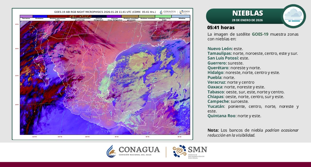 En las próximas tres horas, se pronostica viento de 10 a 25 km/h con rachas de 50 km/h principalmente sobre las zonas de costa del estado. Así mismo se detectan bancos de niebla en zonas del estado, se prevé que prevalezcan durante las próximas tres horas.