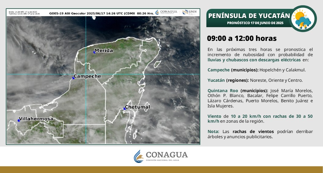 En las próximas tres horas se pronostica lluvias y chubascos con descargas eléctricas en los municipios de: José María Morelos, Othón P. Blanco, Bacalar, Felipe Carrillo Puerto, Lázaro Cárdenas, Puerto Morelos, Benito Juárez e Isla Mujeres.
