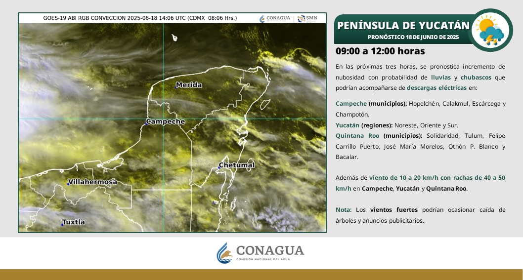 En las próximas tres horas, se pronostica incremento de nubosidad con probabilidad de lluvias y chubascos que podrían acompañarse de descargas eléctricas en los municipios de: Playa del Carmen, Tulum, Felipe Carrillo Puerto, José María Morelos, Othón P. Blanco y Bacalar.