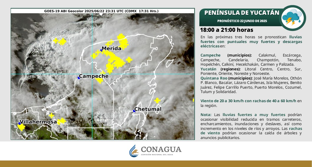 En las próximas tres horas se pronostican lluvias fuertes con puntuales muy fuertes y descargas eléctricas en los municipios de: José María Morelos, Othón P.Blanco, Bacalar, Lázaro Cárdenas, Isla Mujeres, Benito Juárez, Felipe Carrillo Puerto, Puerto Morelos, Cozumel, Tulum y Playa del Carmen.