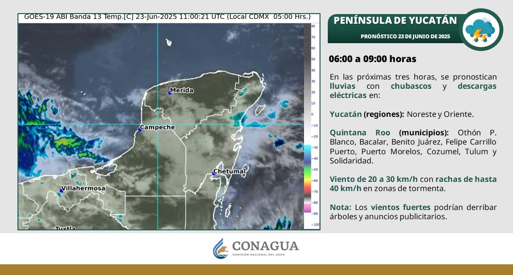 En las próximas tres horas, se pronostican lluvias con chubascos y descargas eléctricas en los municipios de: Othón P. Blanco, Bacalar, Benito Juárez, Felipe Carrillo Puerto, Puerto Morelos, Cozumel, Tulum y Playa del Carmen.