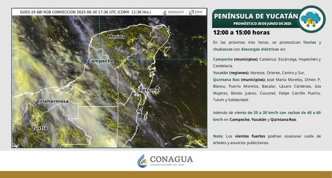 En las próximas tres horas, se pronostican lluvias y chubascos con descargas eléctricas en los municipios de: José María Morelos, Othón P. Blanco, Puerto Morelos, Bacalar, Lázaro Cárdenas, Isla Mujeres, Benito Juárez, Cozumel, Felipe Carrillo Puerto, Tulum y Playa del Carmen.
