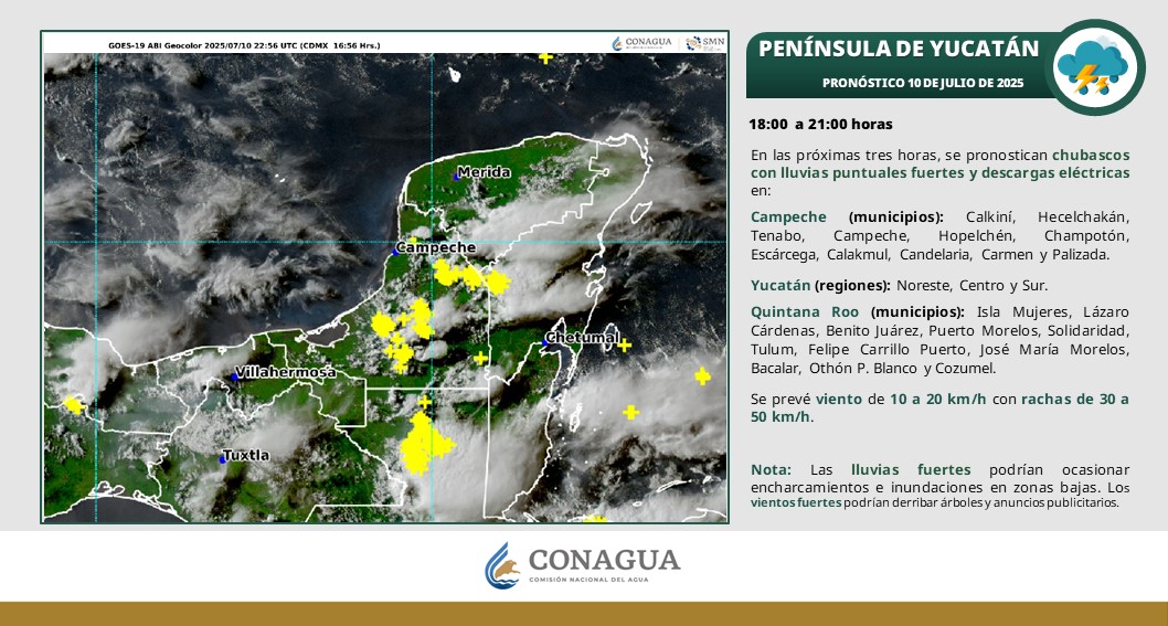 En las próximas tres horas, se pronostican chubascos con lluvias puntuales fuertes y descargas eléctricas en los municipios de: Isla Mujeres, Lázaro Cárdenas, Benito Juárez, Puerto Morelos, Playa del Carmen, Tulum, Felipe Carrillo Puerto, José María Morelos, Bacalar, Othón P. Blanco y Cozumel.