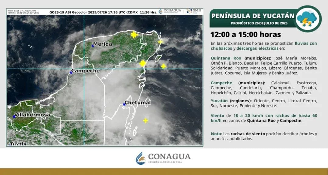 Afluencia de aire húmedo proveniente del mar Caribe hacia la península de Yucatán, originará en el estado de Quintana Roo cielo parcialmente nublado con incremento de nublados, intervalos de chubascos con lluvias puntuales fuertes (acumulados de 25 a 50 mm) acompañados de actividad eléctrica, ambiente caluroso a muy caluroso durante el día, viento con rachas de 50 km/h. Se prevé bancos de niebla en zonas rurales, urbanas y tramos carreteros.