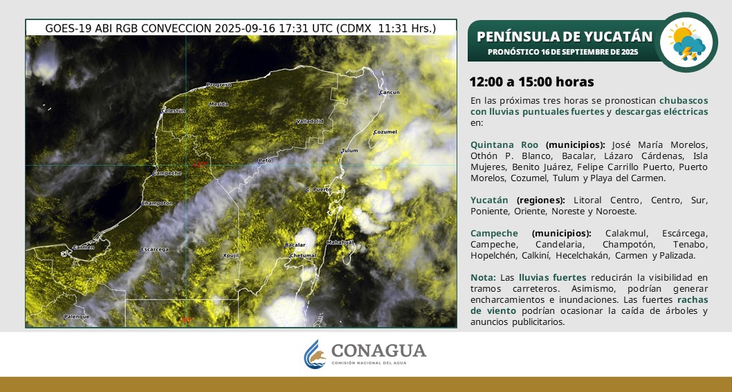 En las próximas tres horas se pronostican chubascos con lluvias puntuales fuertes y descargas eléctricas en los municipios de: José María Morelos, Othồn P. Blanco, Bacalar, Lázaro Cárdenas, Isla Mujeres, Benito Juárez, Felipe Carrillo Puerto, Puerto Morelos, Cozumel, Tulum y Playa del Carmen.