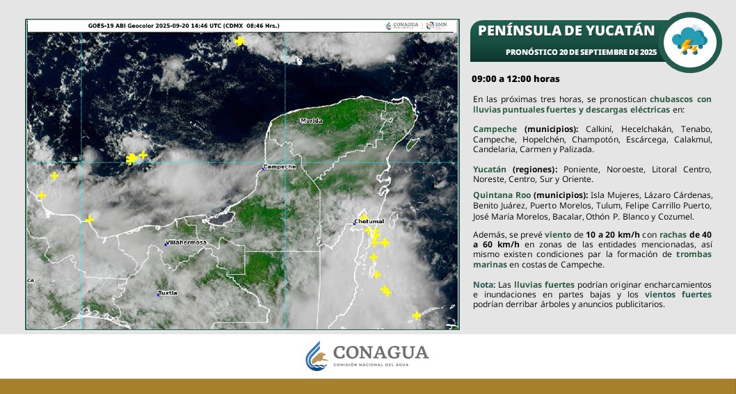 En las próximas tres horas, se pronostican chubascos con lluvias puntuales fuertes y descargas eléctricas en los municipios de: Isla Mujeres, Lázaro Cárdenas, Benito Juárez, Puerto Morelos, Tulum, Felipe Carrillo Puerto, José María Morelos, Bacalar, Othón P. Blanco y Cozumel.