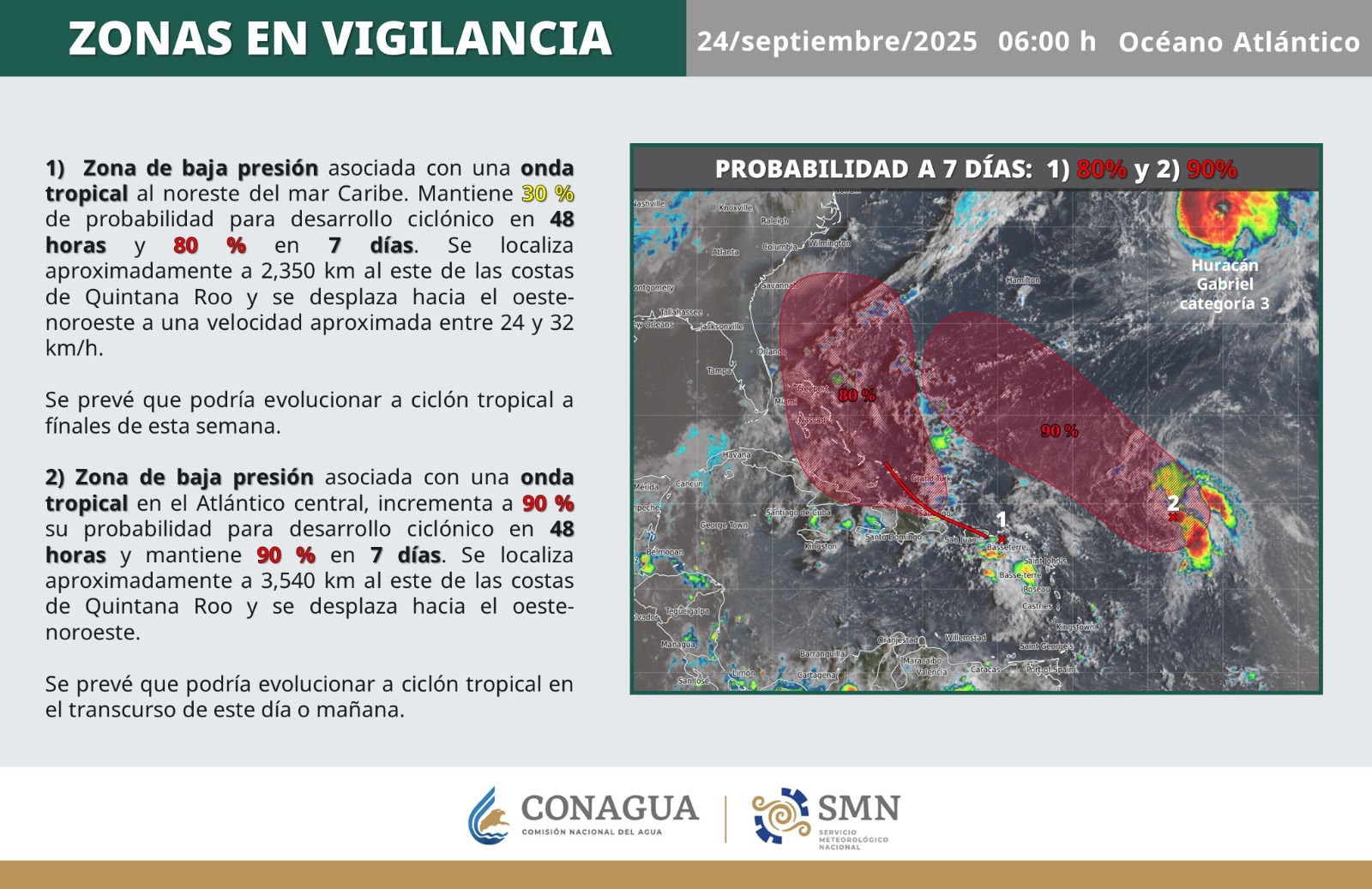Afluencia de aire húmedo proveniente del mar Caribe hacia la península de Yucatán, originará en el estado de Quintana Roo cielo parcialmente nublado con incremento de nublados, intervalos de chubascos con lluvias puntuales fuertes (acumulados de 25 a 50 mm) acompañados de actividad eléctrica, ambiente caluroso a muy caluroso durante el día, viento con rachas de 50 km/h. Se prevé bancos de niebla en zonas rurales, urbanas y tramos carreteros.