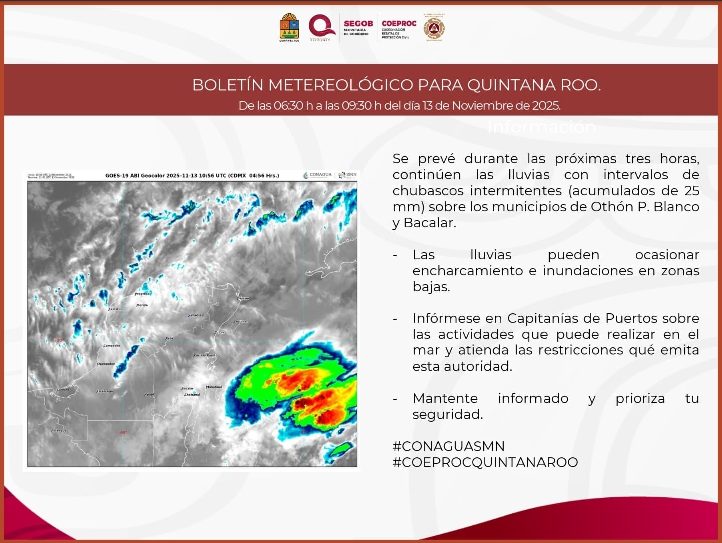 Se prevé durante las próximas tres horas, continúen las lluvias con intervalos de chubascos intermitentes (acumulados de 25 mm) sobre los municipios de Othón P. Blanco y Bacalar.