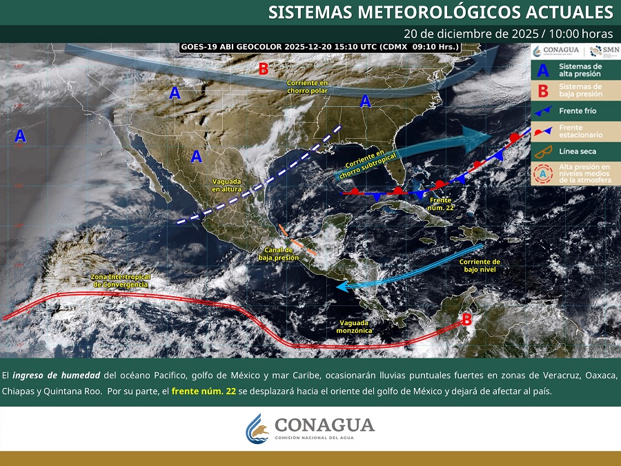 El ingreso de humedad del océano Pacifico, golfo de México y mar Caribe, ocasionarán Iluvias puntuales fuertes en zonas de Veracruz, Oaxaca, Chiapas y Quintana Roo. Por su parte, el frente núm. 22 se desplazará hacia el oriente del golfo de México y dejará de afectar al país.