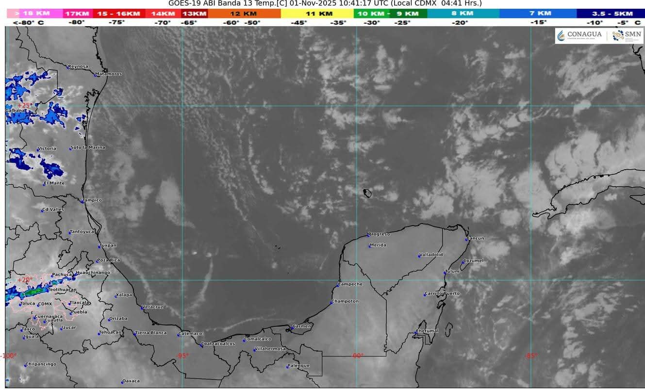 Sistema de alta presión obre el sureste de USA, mantiene el flujo de aire continental polar modificado sobre la península de Yucatán y el estado de Quintana Roo, mantendrá cielo parcialmente nublado, lluvias aisladas, ambiente caluroso durante el día y templado a fresco al amanecer principalmente en las zonas rurales. El viento se mantendrá del noreste y este con rachas de hasta 40 km/h sobre las zonas de costa del estado.