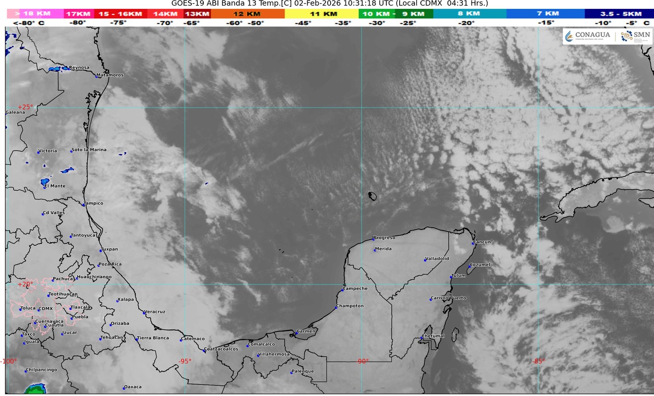 Sistema de alta presión sobre el golfo de México y la masa de aire ártico modificado que impulso al frente frío 32, mantendrán viento fresco del norte con rachas de 40 a 60 km/h sobre las zonas de costa del estado con oleaje elevado de 1.5 a 2.5 metros de altura, cielo parcialmente nublado a despejado, poca probabilidad de lluvia, continuará el ambiente templado a cálido durante el día y fresco a frío por la madrugada y al amanecer. Se prevé bancos de niebla en tramos carretero, zonas rurales y urbanas del estado.