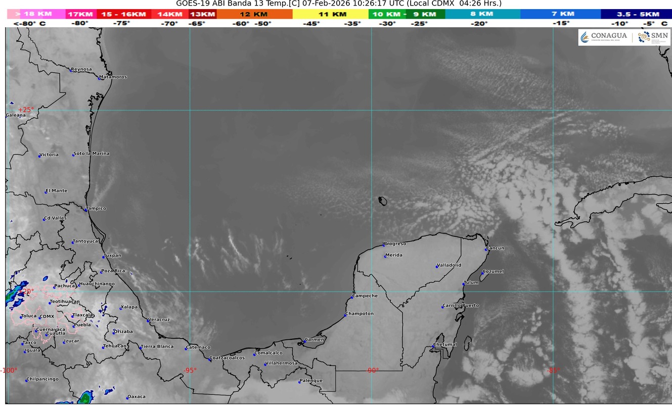 Sistema de alta presión localizado sobre el golfo de México, mantendrá viento fresco del norte con rachas de 30 a 40 km/h principalmente sobre las zonas de costa del estado con oleaje de 2 a 3 metros de altura, cielo parcialmente nublado, sin lluvias, ambiente caluroso a templado durante el día y fresco a frío por la madrugada y al amanecer. Se prevé bancos de niebla en tramos carretero, zonas rurales y urbanas del estado.