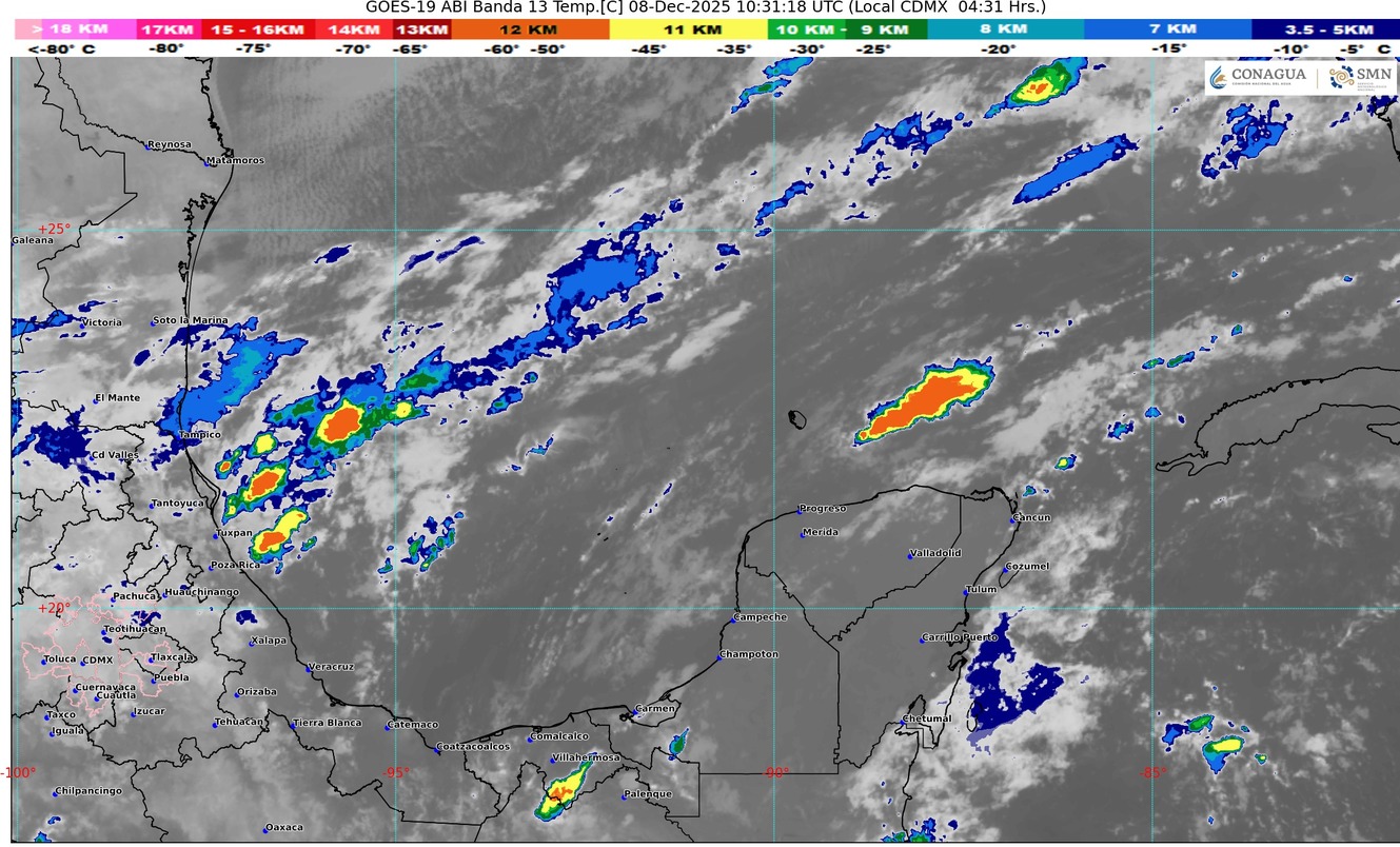 Afluencia de aire húmedo proveniente del mar Caribe hacia la península de Yucatán, originará en el estado de Quintana Roo cielo parcialmente nublado con incremento de nublados, intervalos de chubascos con lluvias puntuales fuertes (acumulados de 25 a 50 mm) acompañados de actividad eléctrica, ambiente caluroso a muy caluroso durante el día, viento con rachas de 50 km/h. Se prevé bancos de niebla en zonas rurales, urbanas y tramos carreteros.