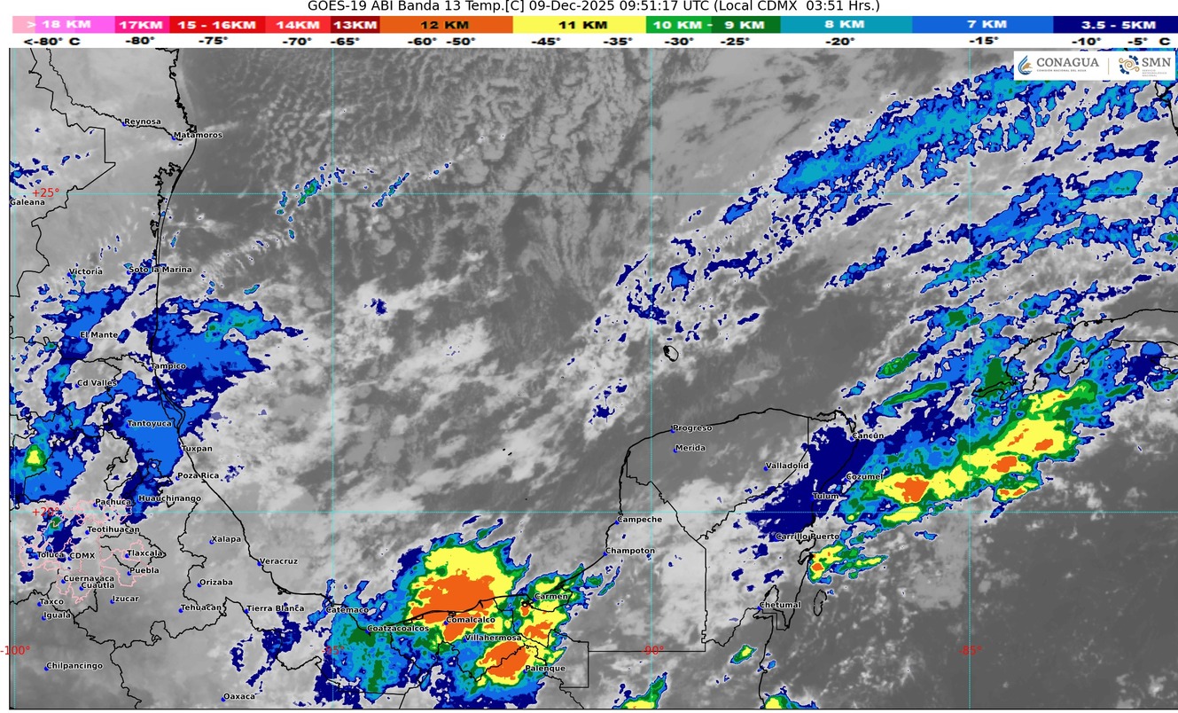 Afluencia de aire húmedo proveniente del mar Caribe hacia la península de Yucatán, originará en el estado de Quintana Roo cielo parcialmente nublado con incremento de nublados, intervalos de chubascos con lluvias puntuales fuertes (acumulados de 25 a 50 mm) acompañados de actividad eléctrica, ambiente caluroso a muy caluroso durante el día, viento con rachas de 50 km/h. Se prevé bancos de niebla en zonas rurales, urbanas y tramos carreteros.