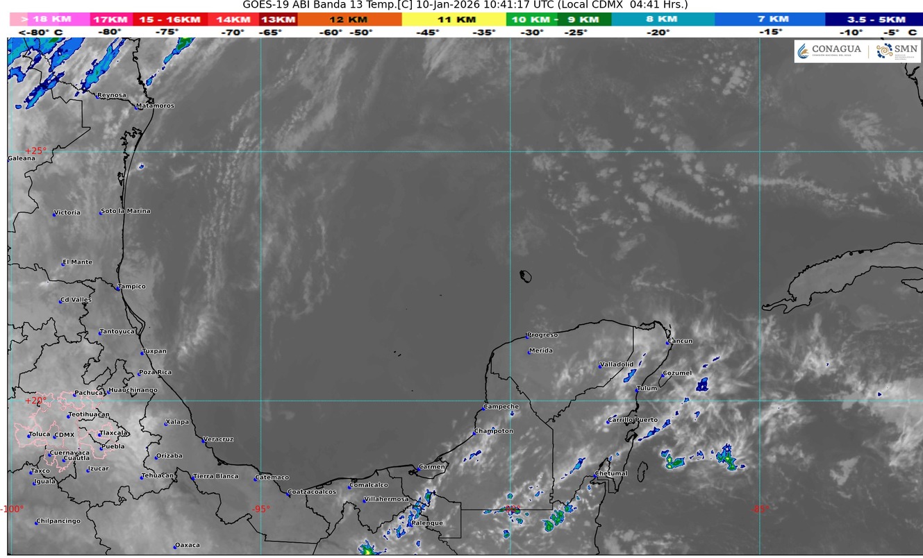 Continúa una circulación anticiclónica en niveles medios de la atmósfera, sin embargo, la entrada de humedad del mar Caribe hacia la península de Yucatán, propiciará sobre el estado de Quinta Roo cielo parcialmente nublado con incremento de nublados durante el transcurso del día, lluvias con intervalos de chubascos (acumulados de 5 a 25 mm), viento con rachas de 40 km/k principalmente sobre las zonas de costa del estado. se prevén bancos de niebla en zonas rurales, urbanas y tramos carreteros.