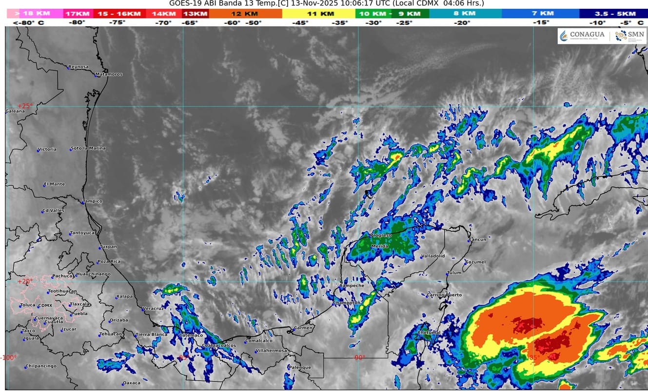 Mantiene un canal de baja presión localizado sobre el occidente del mar Caribe en interacción con inestabilidad atmosférica superior, originarán en el estado de Quintana Roo cielo medio nublado a nublado durante el transcurso del día, lluvias intensas a puntuales torrenciales (acumulados de 150 a 250 mm) principalmente sobre el sur del estado, ambiente templado a caluroso durante el día y fresco a frío por la madrugada y al amanecer especialmente sobre las zonas rurales del estado. El viento se mantendrá del norte y noreste con rachas de 40 km/h, oleaje elevado y la posible formación de trombas marinas. Se prevé bancos de niebla en zonas rurales, urbanas y tramos carreteros.