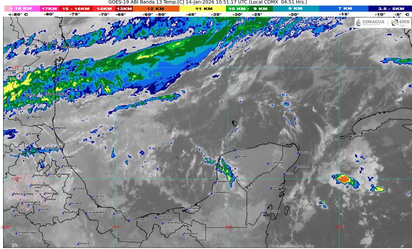 Nuevo frente frío (28) se aproximará a la porción norte del país y recorrerá rápidamente la vertiente del golfo de México, origina viento fresco y arrachado del norte, lluvias y descenso de la temperatura sobre su área de influencia.