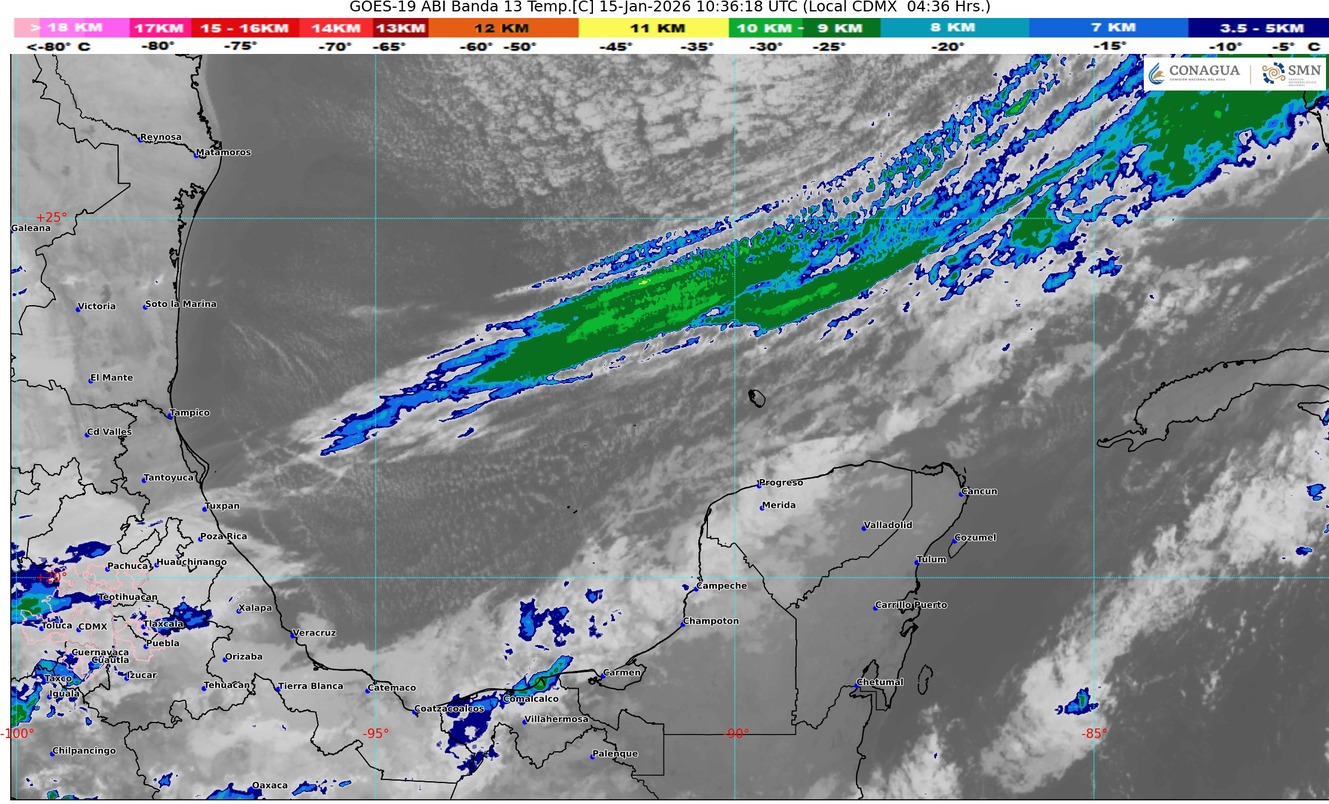Desplazamiento del frente frío 28 sobre la península de Yucatán, ocasionará sobre Quintana Roo cielo medio nublado con incremento de nublados durante el transcurso del día, lluvias con intervalos de chubascos (acumulados de 5 a 25 mm). La masa de aire frío que impulsa al frente ocasionará evento de “Norte” con rachas de viento de 40 a 60 km/h sobre las zonas de costa del estado, ambiente caluroso a templado durante el día y fresco a frío al amanecer principalmente en las zonas rurales del estado. Se prevén bancos de niebla en zonas rurales, urbanas y tramos carreteros.