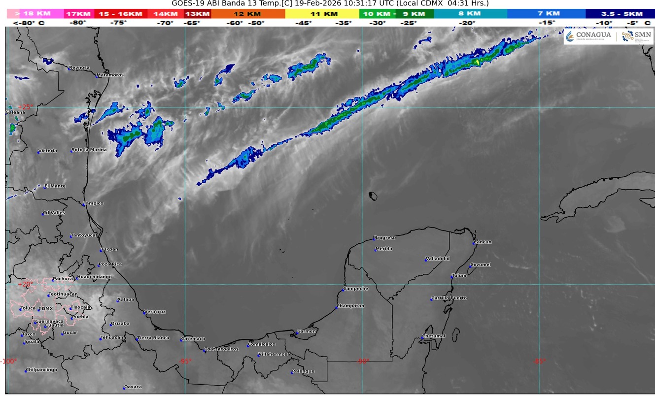 Continúa una circulación anticiclónica en niveles medios de la atmósfera localizada sobre la mayor parte del territorio nacional, mantendrá condiciones mayormente estables, sin embargo, la entrada de humedad del mar Caribe, originará en el estado de Quintana Roo cielo parcialmente nublado, poca probabilidad de lluvias, ambiente caluroso. A partir de este día, dará inicio un evento de “surada” con rachas de viento de 40 a 60 km/h sobre la geografía estatal, principalmente sobre las zonas de costa.