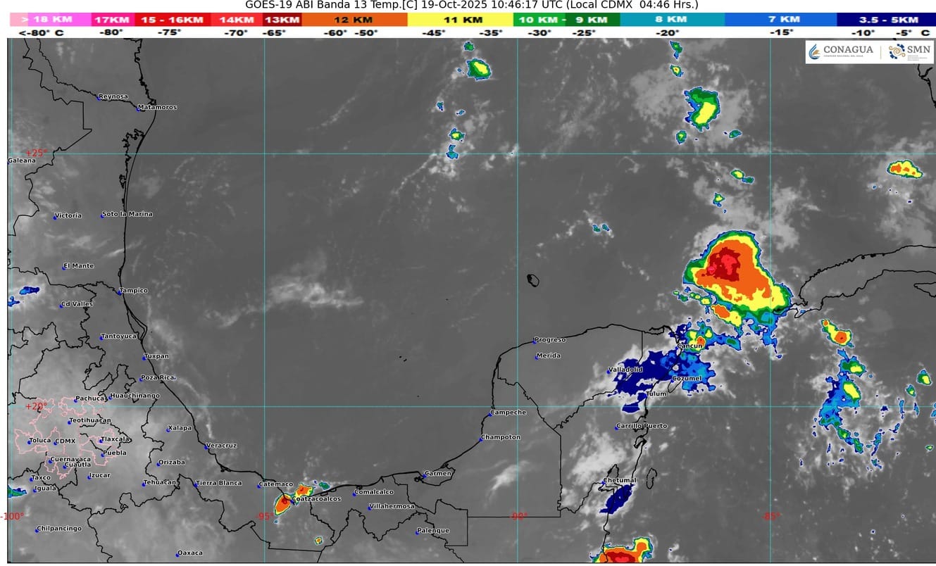Afluencia de aire húmedo proveniente del mar Caribe hacia la península de Yucatán, originará en el estado de Quintana Roo cielo parcialmente nublado con incremento de nublados, intervalos de chubascos con lluvias puntuales fuertes (acumulados de 25 a 50 mm) acompañados de actividad eléctrica, ambiente caluroso a muy caluroso durante el día, viento con rachas de 50 km/h. Se prevé bancos de niebla en zonas rurales, urbanas y tramos carreteros.