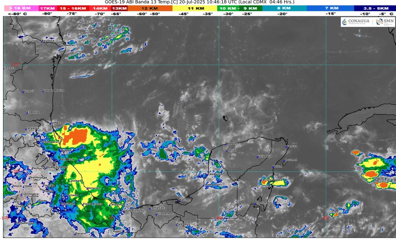 La afluencia de aire marítimo con variable contenido de humedad proveniente del mar Caribe hacia la península de Yucatán y un canal de baja presión sobre la región peninsular, mantendrán en el estado de Quintana Roo cielo parcialmente nublado con incremento de nublados durante el transcurso del día, lluvias con intervalos de chubascos acompañados de actividad eléctrica, ambiente muy caluroso durante el día y caluroso a cálido por la noche y al amanecer. Viento con rachas de 50 km/h principalmente sobre las zonas de costa del estado.