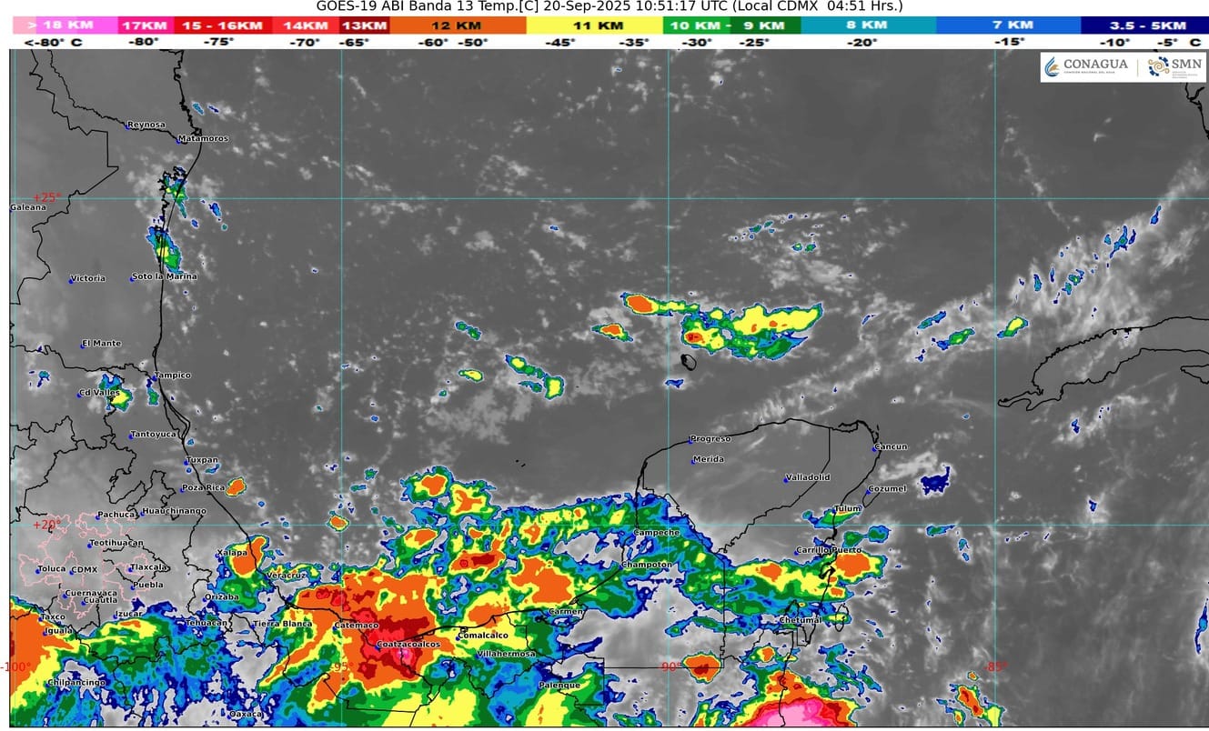 PERÍODO DE VALIDEZ: DE LAS 06:00 H DEL DÍA 20 DE SEPTIEMBRE, A LAS 06:00 H DEL DÍA 21 DE SEPTIEMBRE DEL 2025.Vaguada en altura localizada sobre el sureste del golfo de México y la entrada de humedad del mar Caribe hacia la península de Yucatán, mantendrán en el estado de Quintana Roo cielo parcialmente nublado con incremento de nublados durante el transcurso del día, intervalos de chubascos con lluvias puntuales fuertes acompañadas de actividad eléctrica, ambiente muy caluroso durante el día y cálido a caluroso por la noche y al amanecer. Viento con rachas de 40 km/h principalmente sobre las zonas de costa del estado.