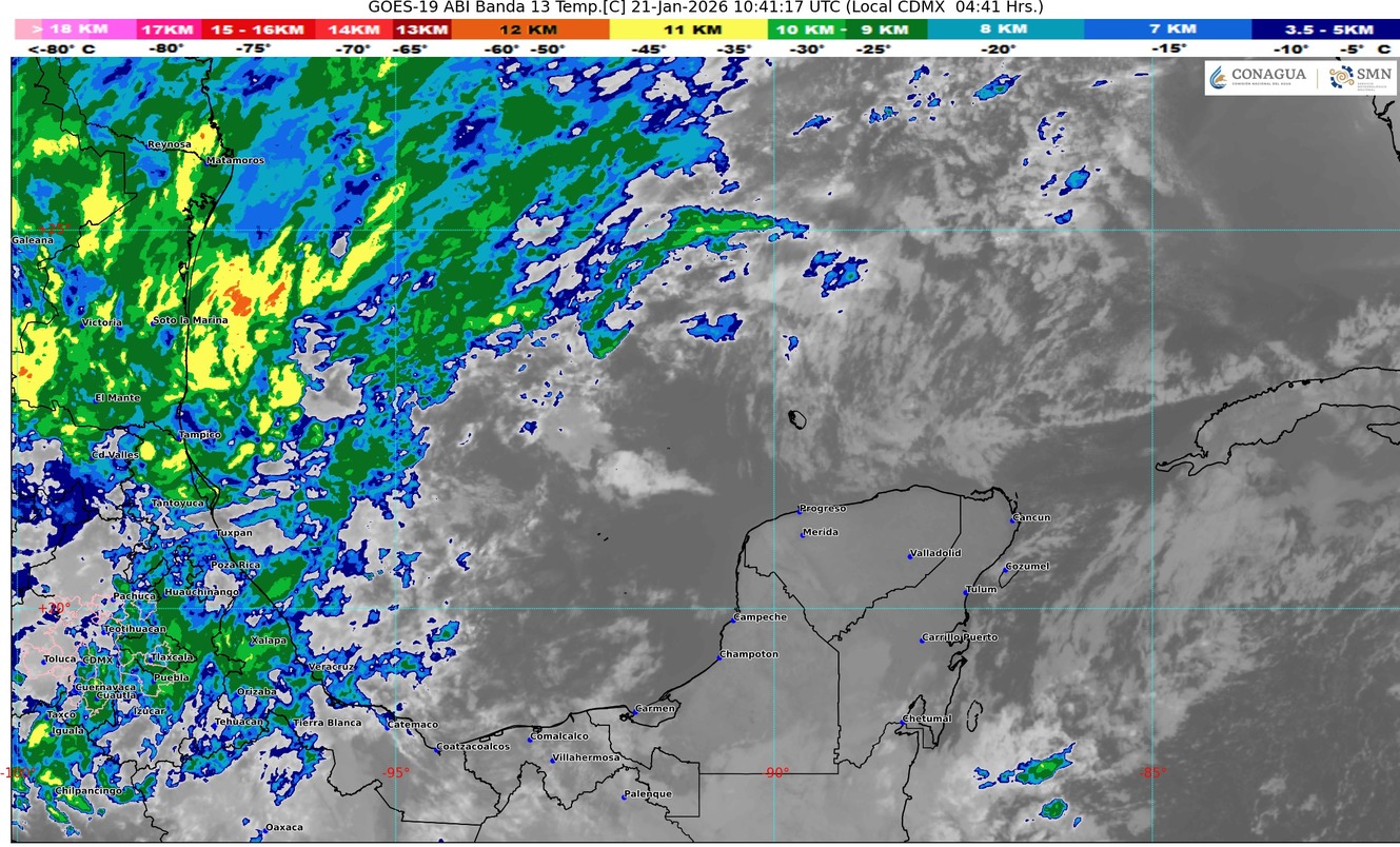 La entrada de humedad del golfo de México y el Mar Caribe hacia la península de Yucatán, propiciará en Quintana Roo cielo parcialmente nublado con incremento de nublados durante el transcurso del día, intervalos de chubascos con lluvias puntuales fuertes (acumulados de 25 a 50 mm), viento con rachas de 40 km/h principalmente sobre las zonas de costa del estado, ambiente cálido a templado durante el día y fresco por la madrugada y al amanecer, percibiéndose sensaciones térmicas menores en zonas rurales del estado.