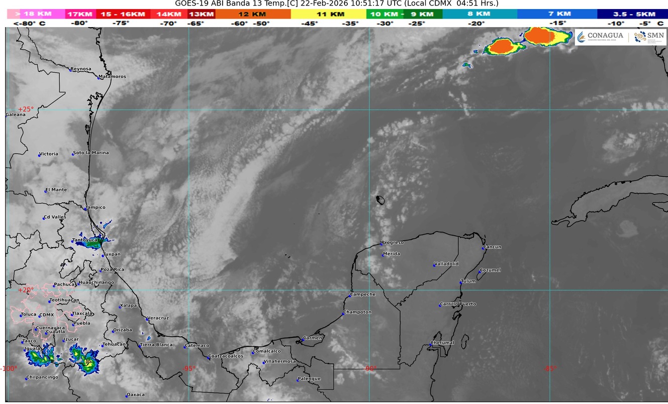 Desplazamiento del frente frío 37 y la vaguada prefrontal que le acompaña sobre la vertiente del golfo de México y su acercamiento a la península de Yucatán, originará en el estado de Quintana Roo cielo parcialmente nublado con incremento de nublados durante el transcurso del día, intervalos de chubascos con lluvias puntuales fuertes (acumulados de 25 a 50 mm), ambiente cálido a caluroso. La masa de aire ártico que impulsa al frente frío, originará a partir de la madrugada del lunes evento de “Norte” muy fuerte con vientos del norte y noreste, rachas de 60 a 80 km/h con oleaje de 3 a 4 metros de altura principalmente sobre las zonas de costa del norte del estado. Se prevé bancos de niebla en zonas rurales, urbanas y tramos carreteros.