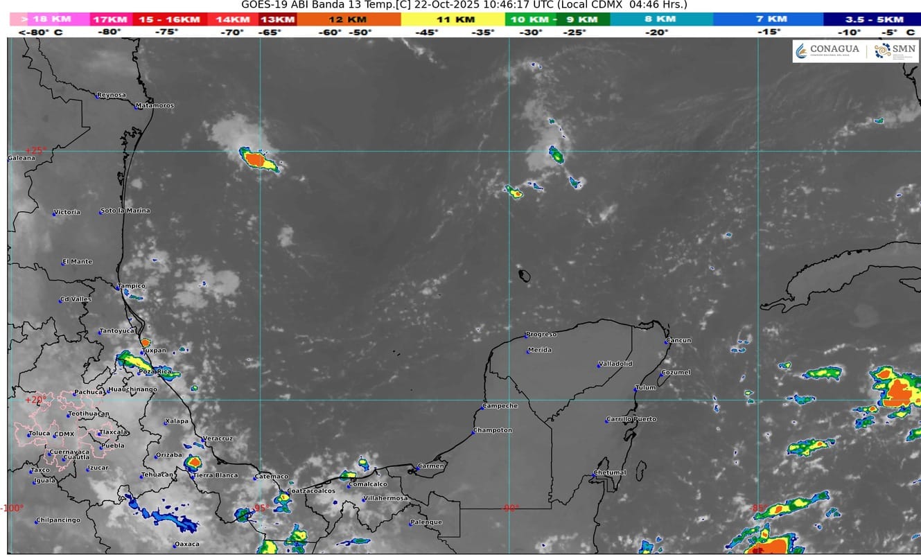 Afluencia de aire húmedo proveniente del mar Caribe hacia la península de Yucatán, originará en el estado de Quintana Roo cielo parcialmente nublado con incremento de nublados, intervalos de chubascos con lluvias puntuales fuertes (acumulados de 25 a 50 mm) acompañados de actividad eléctrica, ambiente caluroso a muy caluroso durante el día, viento con rachas de 50 km/h. Se prevé bancos de niebla en zonas rurales, urbanas y tramos carreteros.