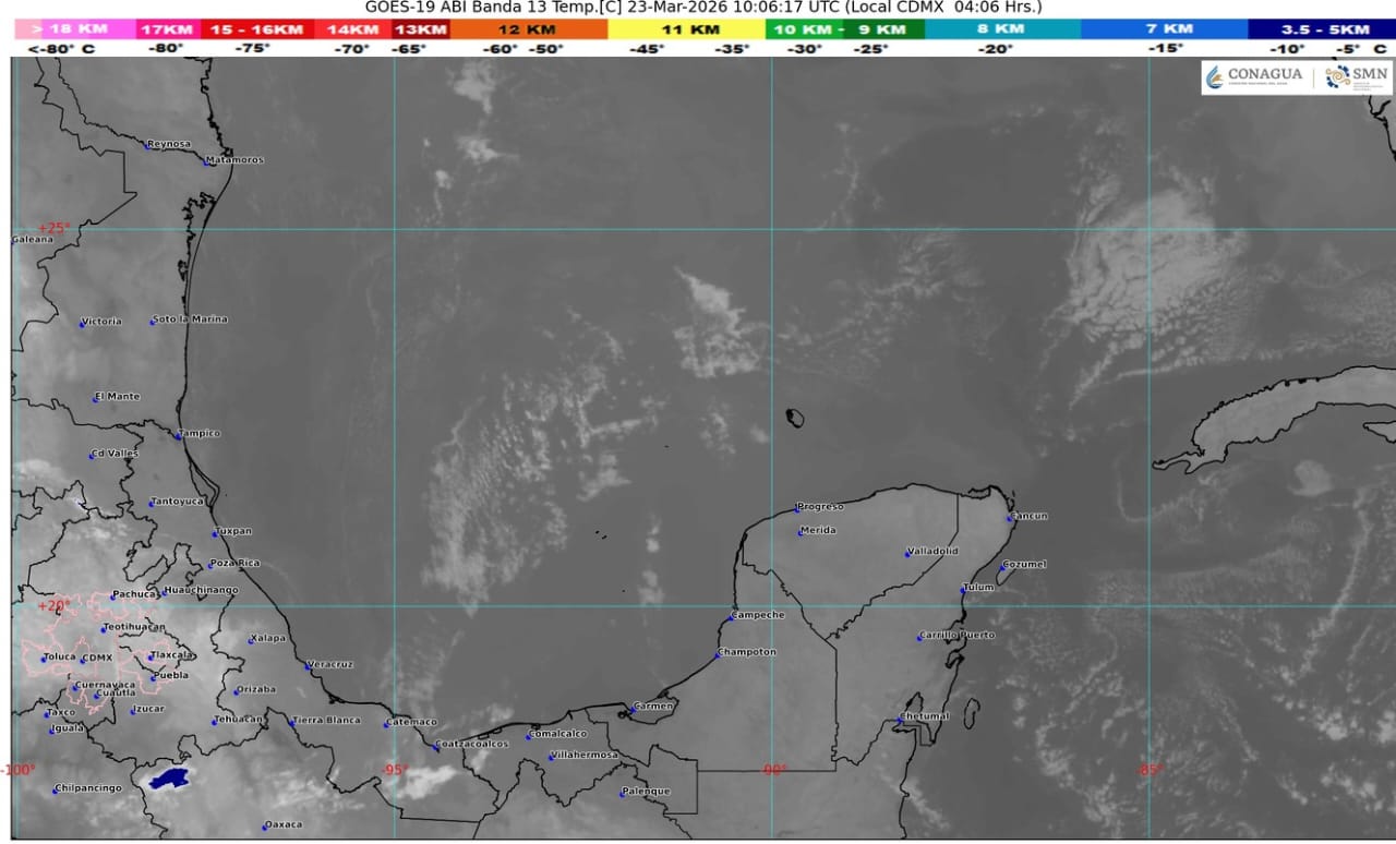 Se mantiene un sistema de alta presión localizado sobre el noreste del golfo de México mantendrá viento del este con tiempo mayormente estable sobre la península de Yucatán, en el estado de Quintana Roo, prevalecerá cielo parcialmente nublado, lluvias aisladas (acumulados menores a 5 mm), ambiente caluroso durante el día. Viento con rachas de hasta 40 km/h principalmente sobre las zonas de costa del estado.