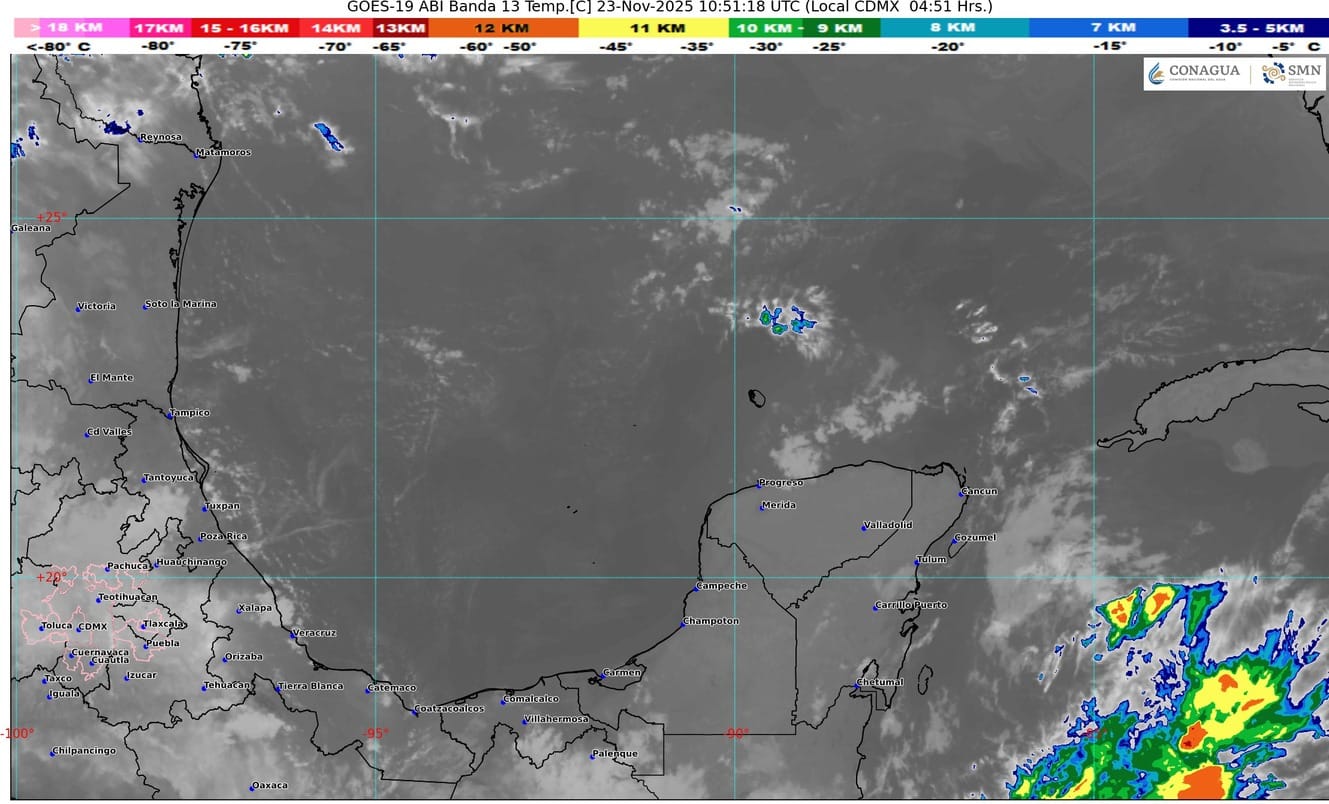 Ingreso de humedad del mar Caribe, originarán en el estado de Quintana Roo cielo parcialmente nublado con incremento de nublados durante el transcurso del día, lluvias con intervalos de chubascos (acumulados de 5 a 25 mm) más frecuentes por la tarde o noche, ambiente caluroso durante el día. Viento con rachas de 40 km/h. Se prevén bancos de niebla en zonas rurales, urbanas y tramos carreteros.