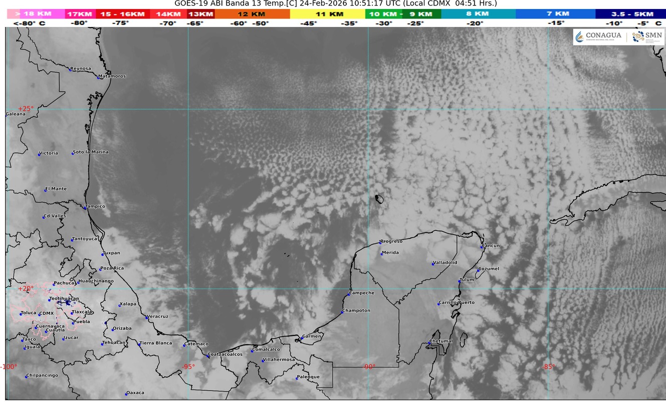 Afluencia de aire húmedo proveniente del mar Caribe hacia la península de Yucatán, originará en el estado de Quintana Roo cielo parcialmente nublado con incremento de nublados, intervalos de chubascos con lluvias puntuales fuertes (acumulados de 25 a 50 mm) acompañados de actividad eléctrica, ambiente caluroso a muy caluroso durante el día, viento con rachas de 50 km/h. Se prevé bancos de niebla en zonas rurales, urbanas y tramos carreteros.