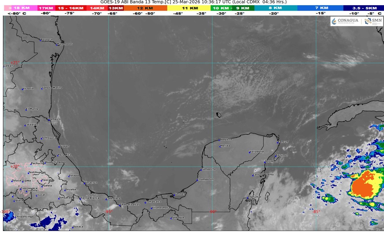 Entrada de aire húmedo del mar Caribe hacia la península de Yucatán, mantendrá en el estado de Quintana Roo cielo parcialmente nublado con incremento de nublados, lluvias con intervalos de chubascos (acumulados de 5 a 25 mm) acompañados de actividad eléctrica, ambiente caluroso durante el día. Viento con rachas de hasta 40 km/h principalmente sobre las zonas de costa del estado.
