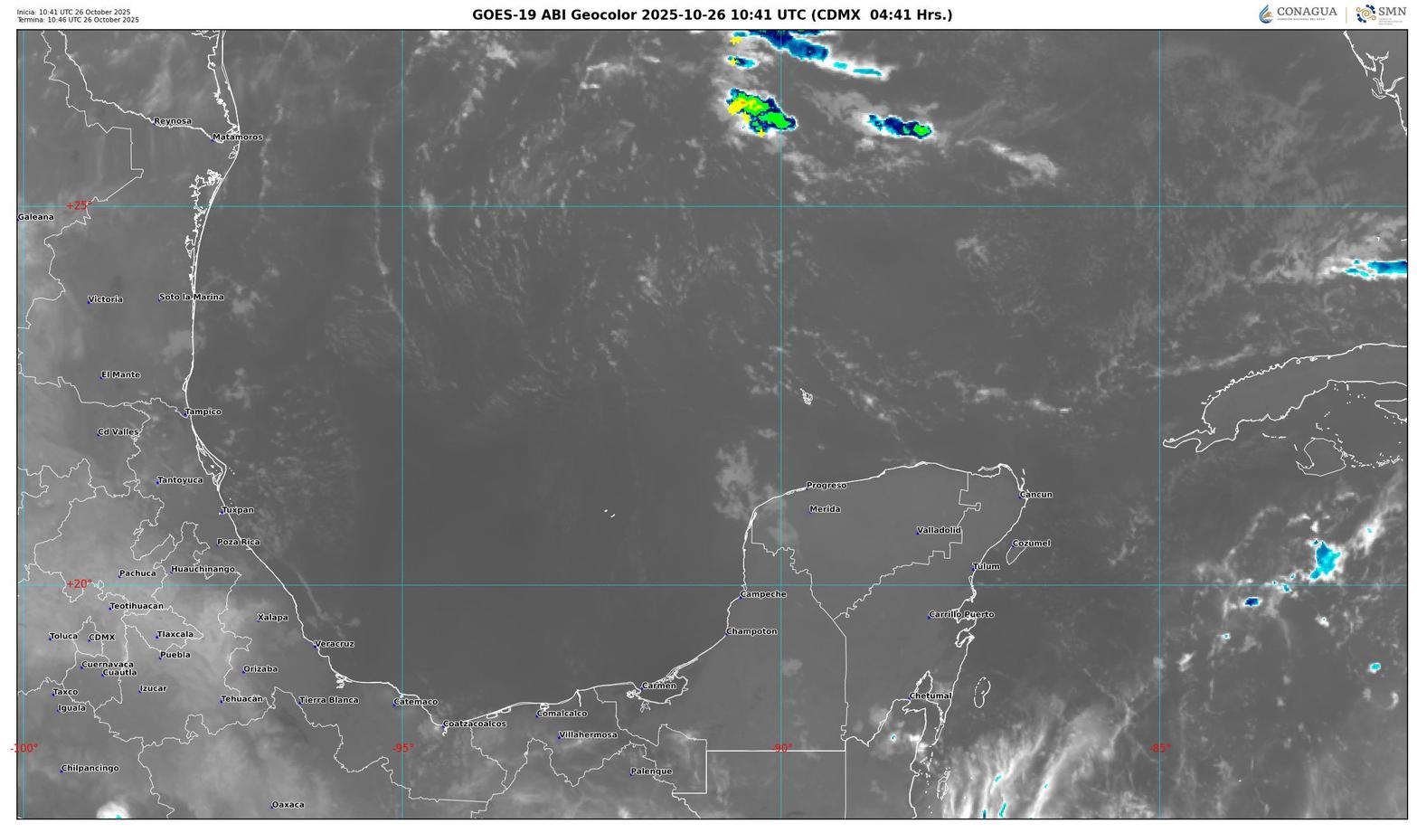 Afluencia de humedad del mar Caribe y golfo de México hacia la península de Yucatán, mantendrán sobre el estado de Quintana Roo cielo parcialmente nublado con incremento de nublados durante el transcurso del día, lluvias con intervalos de chubascos (acumulados de 5 a 25 mm), ambiente muy caluroso. Viento con rachas de 40 km/h principalmente sobre las zonas de costa. Se prevé bancos de niebla en zonas rurales, urbanas y tramos carreteros.