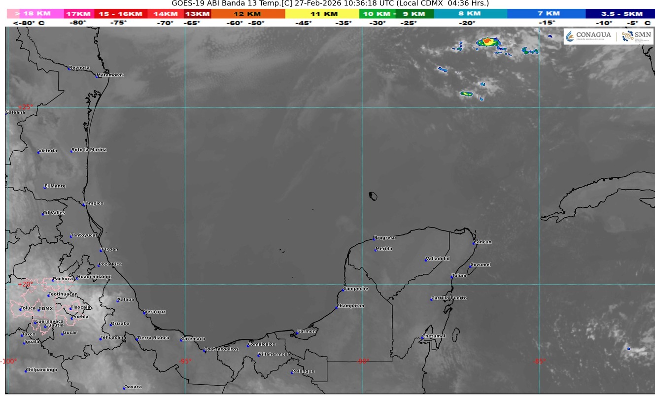 Afluencia de aire húmedo proveniente del mar Caribe hacia la península de Yucatán, originará en el estado de Quintana Roo cielo parcialmente nublado con incremento de nublados durante el transcurso del día, lluvias aisladas (acumulados menores a 5 mm), ambiente caluroso durante el día. Se prevé bancos de niebla en zonas rurales, urbanas y tramos carreteros. Durante este día continuará el evento de “Surada” con rachas de viento del sureste de hasta 50 km/h principalmente sobre las zonas de costa del estado, perdiendo intensidad por la tarde de este día