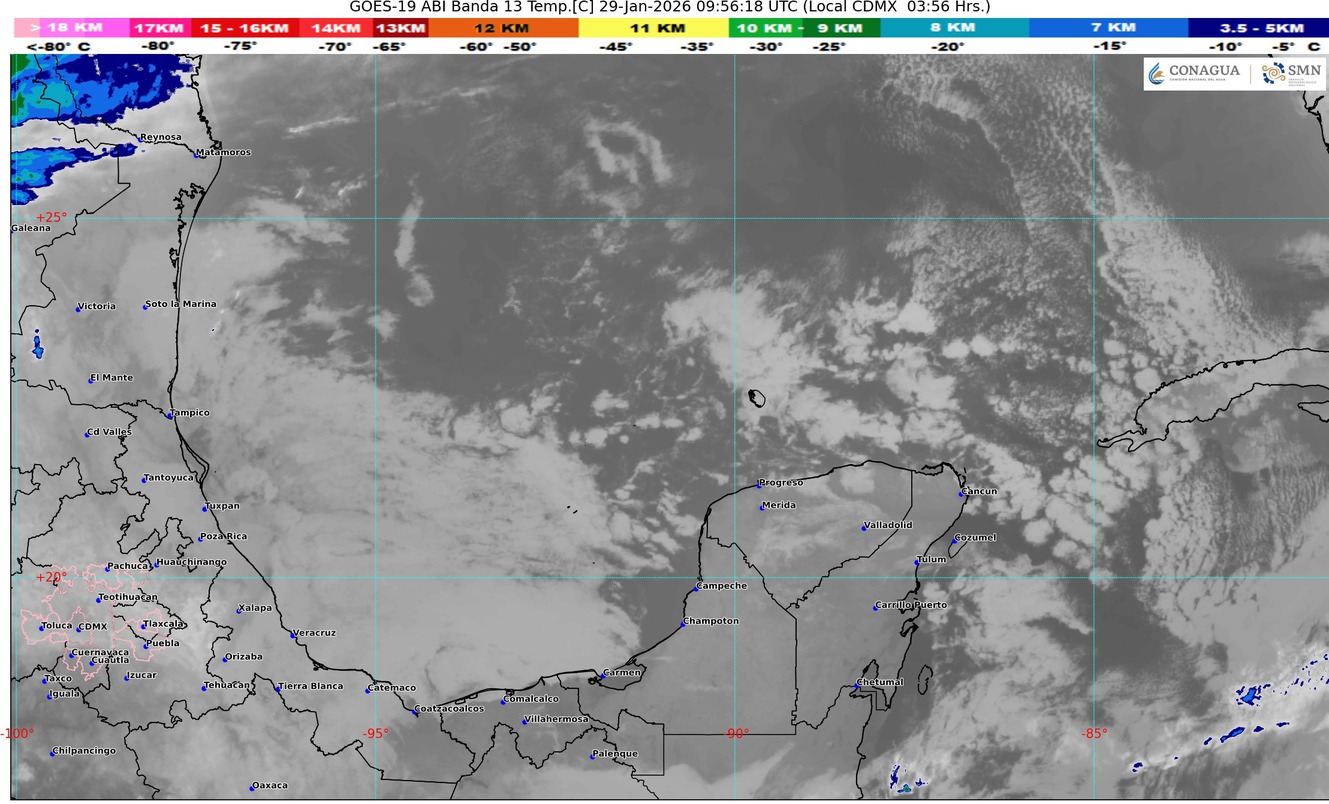 Sistema de alta presión localizado sobre el norte del golfo de México mantendrá sobre el estado de Quintana Roo viento de componente norte con rachas de 40 km/h, cielo parcialmente nublado a nublado, lluvias aisladas (acumulados menores a 5 mm), ambiente cálido a templado durante el día y fresco a frío por la madrugada y al amanecer. Se prevén bancos de niebla en zonas rurales, urbanas y tramos carreteros.