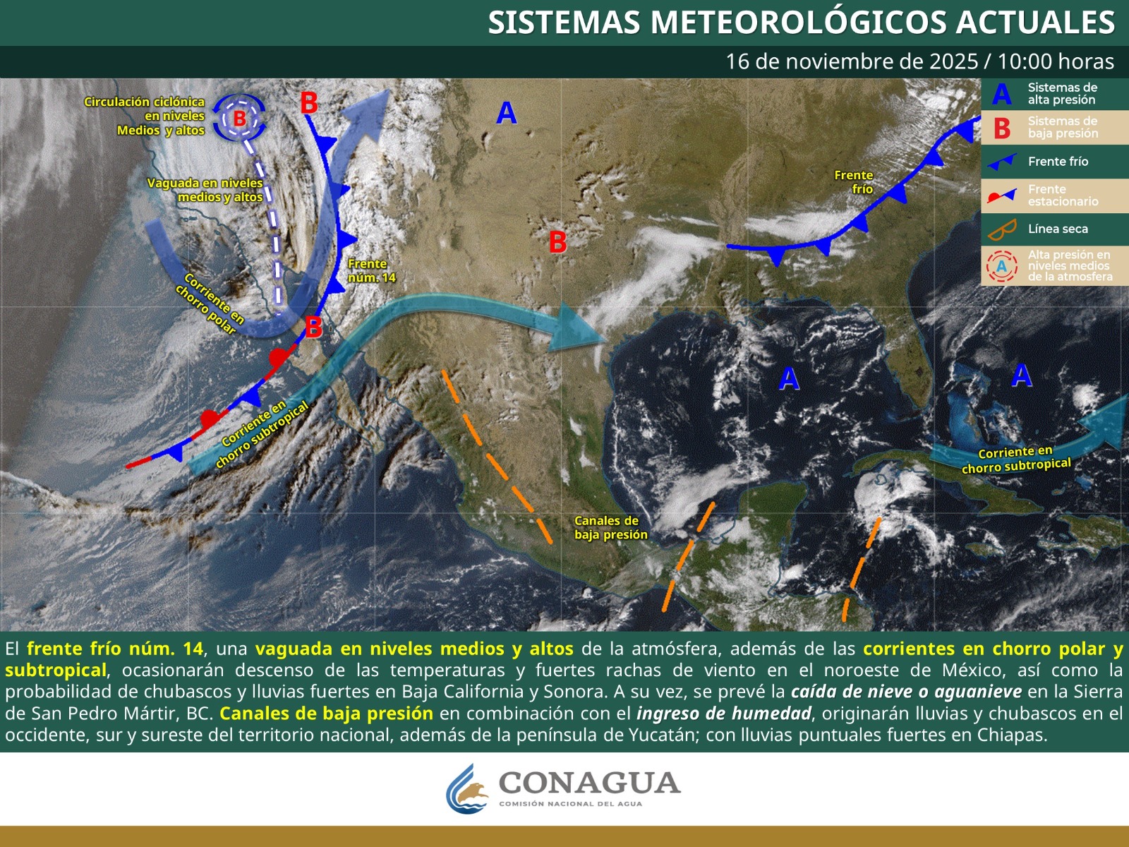 El frente frío núm. 14, una vaguada en niveles medios y altos de la atmósfera, además de las corrientes en chorro polar y subtropical, ocasionarán descenso de las temperaturas y fuertes rachas de viento en el noroeste de México, así como probabilidad de chubascos y lluvias fuertes en Baja California y Sonora. A su vez, se prevé la caída de nieve o aguanieve en la Sierra de San Pedro Mártir, BC. Canales de baja presión en combinación con el ingreso de humedad, originarán lluvias y chubascos en el occidente, sur y sureste del territorio nacional, además de la península de Yucatán; con lluvias puntuales fuertes en Chiapas.