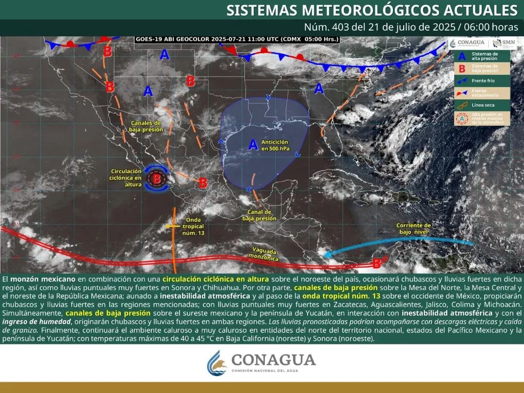 El monzón mexicano en combinación con una circulación ciclónica en altura sobre el noroeste del país, ocasionará chubascos y lluvias fuertes en dicha región.