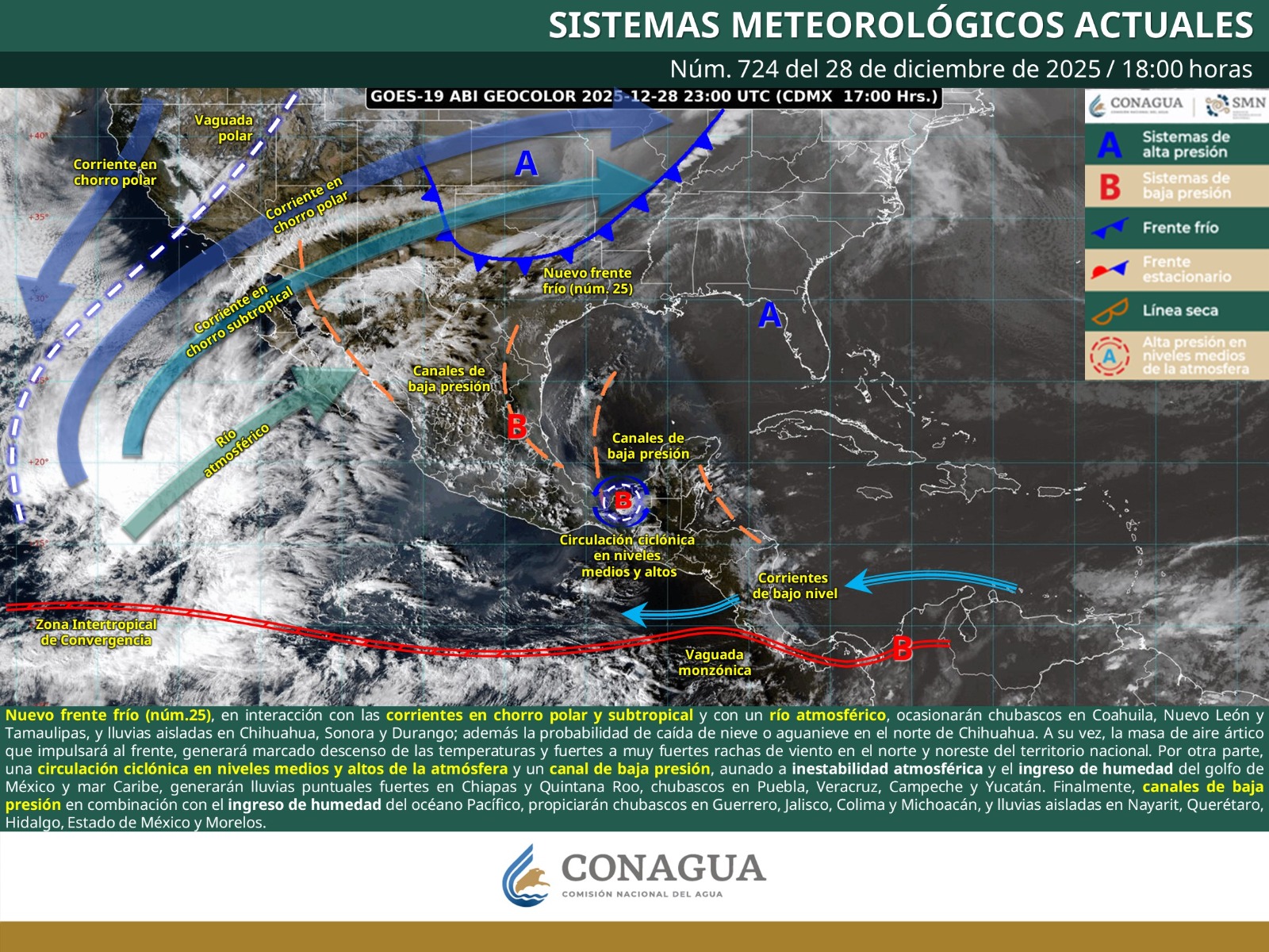 El Nuevo frente frío (núm.25), en interacción con las corrientes en chorro polar y subtropical y con un río atmosférico, ocasionarán chubascos en Coahuila, Nuevo León Tamaulipas, y lluvias aisladas en Chihuahua, Sonora y Durango; además la probabilidad de caída de nieve o aguanieve en el norte de Chihuahua. A su vez, la masa de aire ártico que impulsará al frente, generará marcado descenso de las temperaturas y fuertes a muy fuertes rachas de viento en el norte y noreste del territorio nacional. Por otra parte, una circulación ciclónica en niveles medios y altos de la atmósfera y un canal de baja presión, aunado a inestabilidad atmosférica y el ingreso de humedad del golfo de México y mar Caribe, generarán lluvias puntuales fuertes en Chiapas y Quintana Roo, chubascos en Puebla, Veracruz, Campeche y Yucatán. Finalmente, canales de baja presión en combinación con el ingreso de humedad del océano Pacífico, propiciarán chubascos en Guerrero, Jalisco, Colima y Michoacán, y lluvias aisladas en Nayarit, Querétaro, Hidalgo, Estado de México y Morelos.