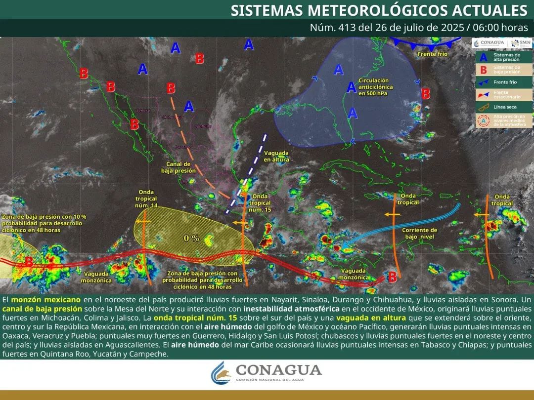 Un canal de baja presión sobre la Mesa del Norte y su interacción con inestabilidad atmosférica en el occidente de México, originará lluvias puntuales fuertes en Michoacán, Colima y Jalisco. La onda tropical núm. 15 sobre el sur del pais y una vaguada en altura que se extenderá sobre el oriente, centro y sur la República Mexicana, en interacción con el aire húmedo del golfo de México y océano Pacífico, generarán lluvias puntuales intensas en Oaxaca, Veracruz y Puebla.