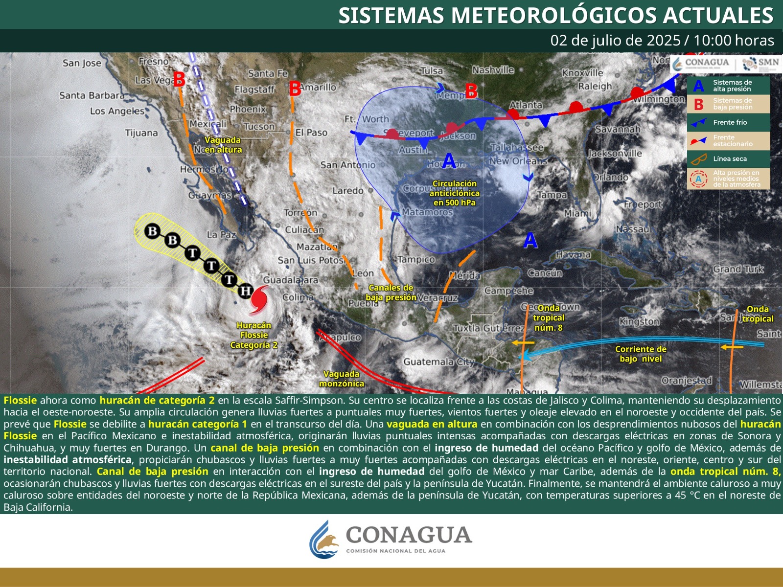 Flossie ahora como huracán de categoría 2 en la escala Saffir-Simpson. Su centro se localiza frente a las costas de Jalisco y Colima, manteniendo su desplazamiento hacia el oeste-noroeste.
