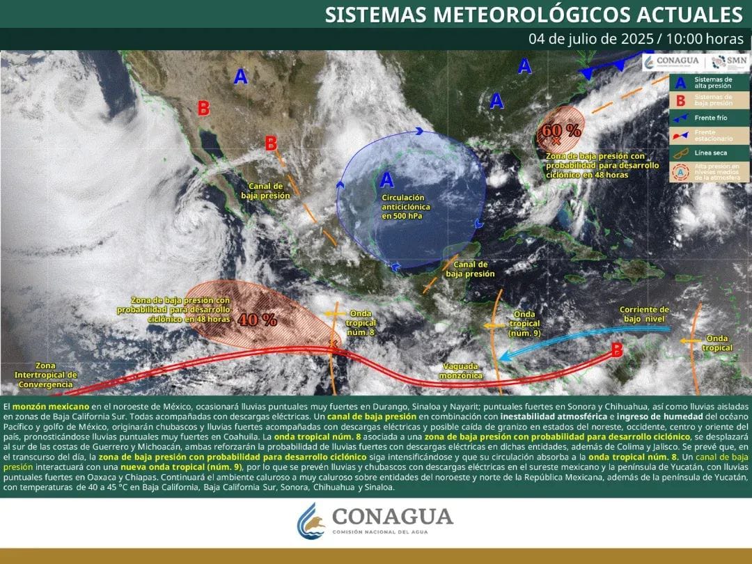 El monzón mexicano en el noroeste de México, ocasionará lluvias puntuales muy fuertes en Durango, Sinaloa y Nayarit.