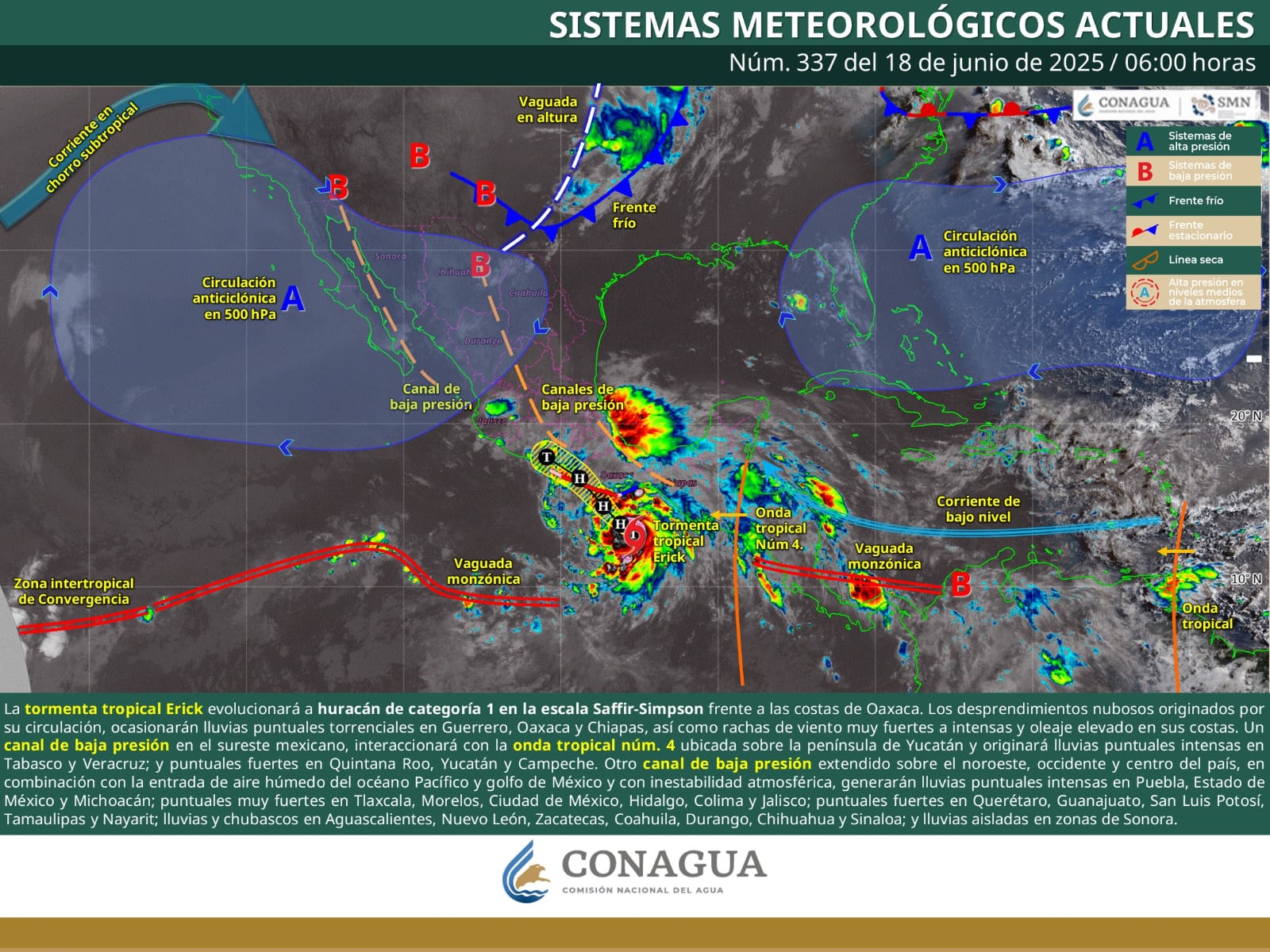 La tormenta tropical Erick evolucionará a huracán de categorfa 1 en la escala Saffir-Simpson frente a las costas de Oaxaca. Los desprendimientos nubosos originados por su circulación, ocasionarán lluvias puntuales torrenciales en Guerrero, Oaxaca y Chiapas,
